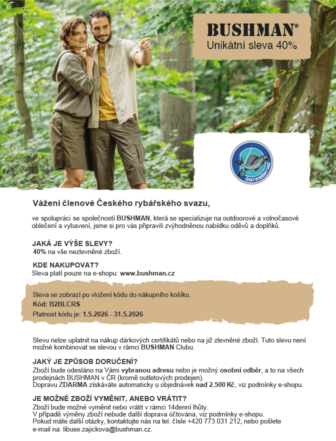 Vážené rybářky, vážení rybáři, ve spolupráci s firmou Bushman jsme pro všechny naše členy opět připravili 40% slevu na výrobky této české společnosti. Podrobnosti naleznete níže.